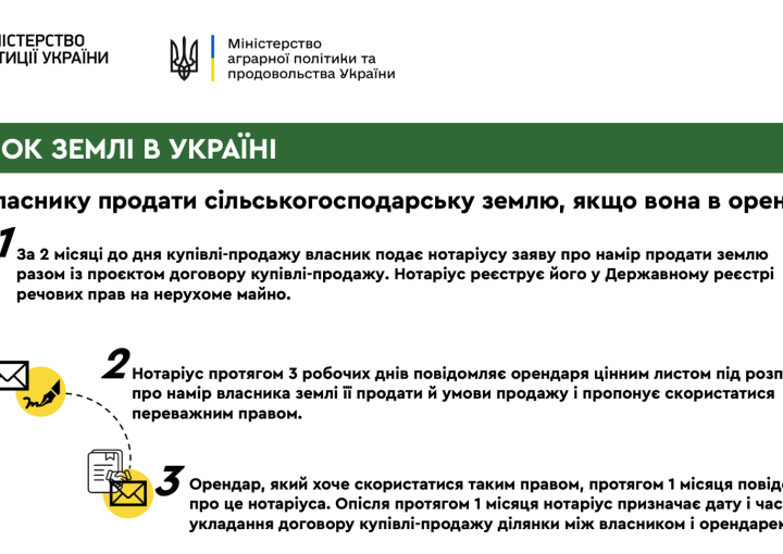 – власник зобов’язаний не пізніш як за 2 місяці до дня купівлі-продажу подати заяву нотаріусу про намір продати землю, нотаріус реєструє у Державному реєстрі речових прав на нерухоме майно…