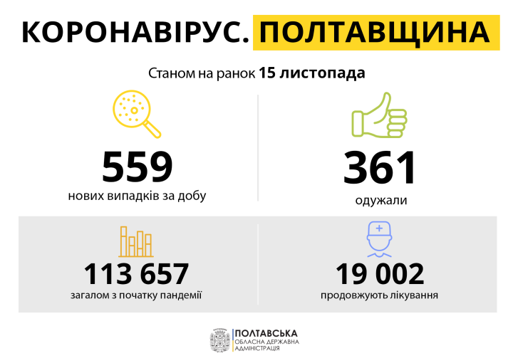 За добу на Полтавщині виявили 559 нових випадків захворювання на COVID-19