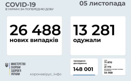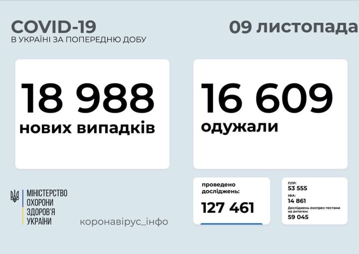 18 988 нових випадків COVID-19 зафіксовано в Україні станом на 9 листопада 2021 року. Зокрема, захворіли 1183 дитини та 426 медпрацівників.