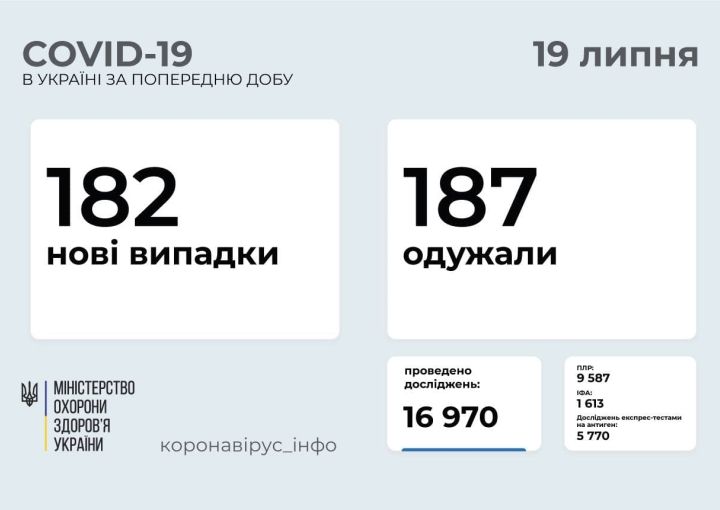 182 нові випадки COVID-19 зафіксовано в Україні станом на 19 липня 2021 року. Зокрема, захворіли 11 дітей.