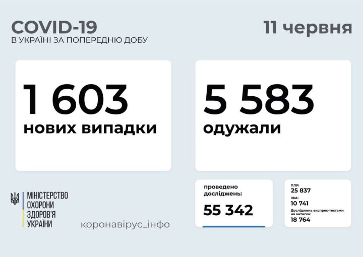 1 603 нових випадків коронавірусної хвороби COVID-19 зафіксовано в Україні станом на 11 червня 2021 року. Зокрема, захворіли 75 дітей та 72 медпрацівники.