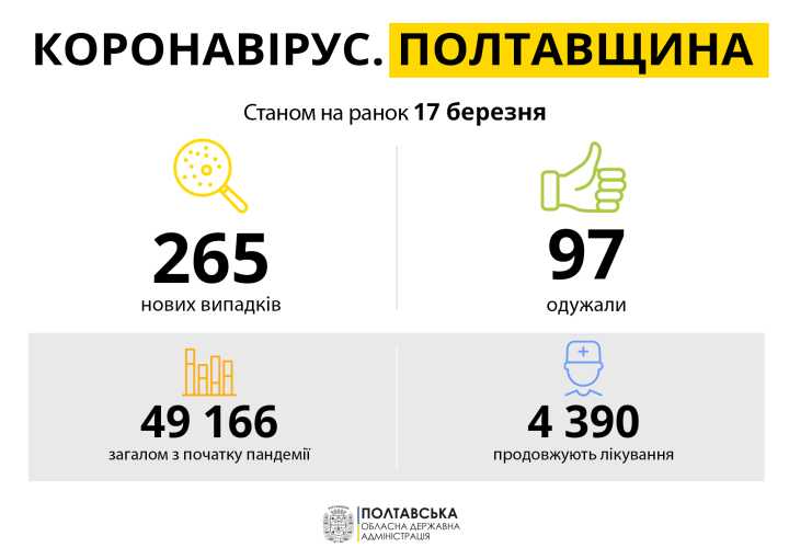 НА ПОЛТАВЩИНІ ЗА МИНУЛУ ДОБУ ЗАРЕЄСТРОВАНО 265 НОВИХ ВИПАДКІВ ЗАХВОРЮВАННЯ НА COVID-19