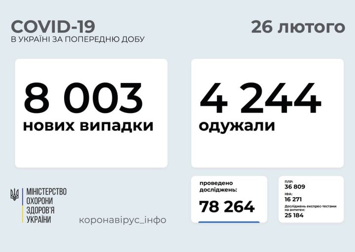 8 003 нових випадки коронавірусної хвороби COVID-19 зафіксовано в Україні станом на 26 лютого 2021 року. Зокрема, захворіли 475 дітей та 312 медпрацівників.