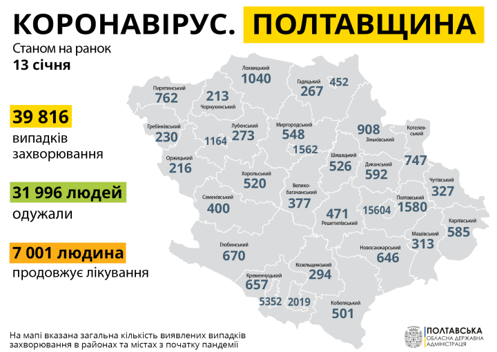 За інформацією Полтавського обласного лабораторного центру МОЗ України, від початку карантину на Полтавщині діагностували 39 816 випадків захворювання на COVID-19.