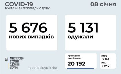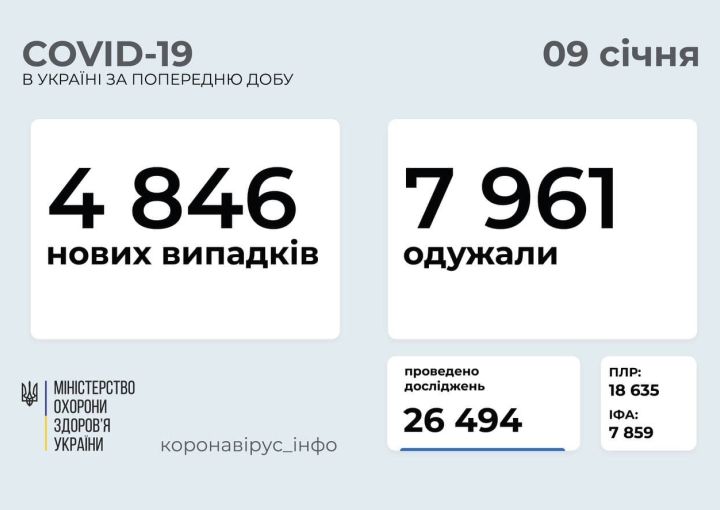 4 846 нових випадків коронавірусної хвороби COVID-19 зафіксовано в Україні станом на 9 січня 2021 року. Зокрема, захворіли 168 дітей та 176 медпрацівників.