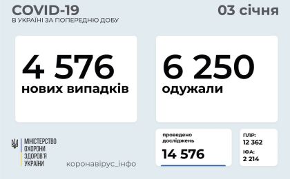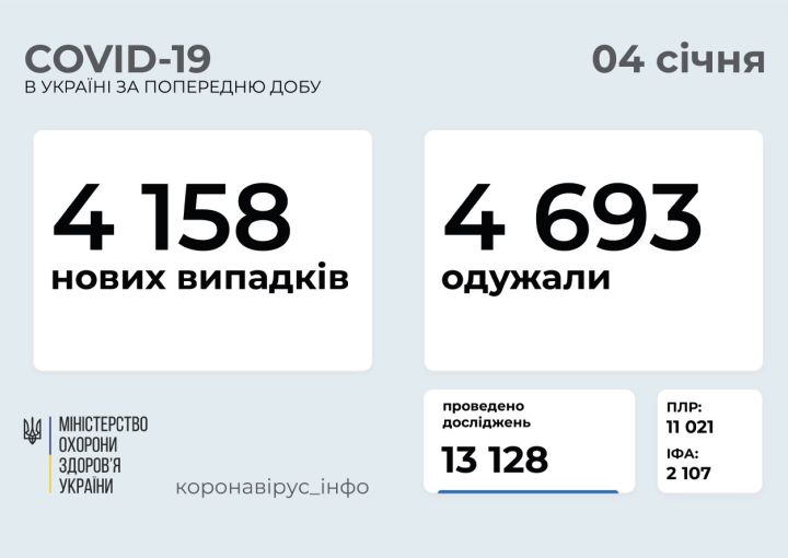 4 158 нових випадків коронавірусної хвороби COVID-19 зафіксовано в Україні станом на 4 січня 2021 року. Зокрема, захворіли 170 дітей та 163 медпрацівники.