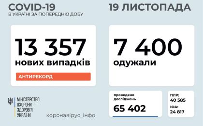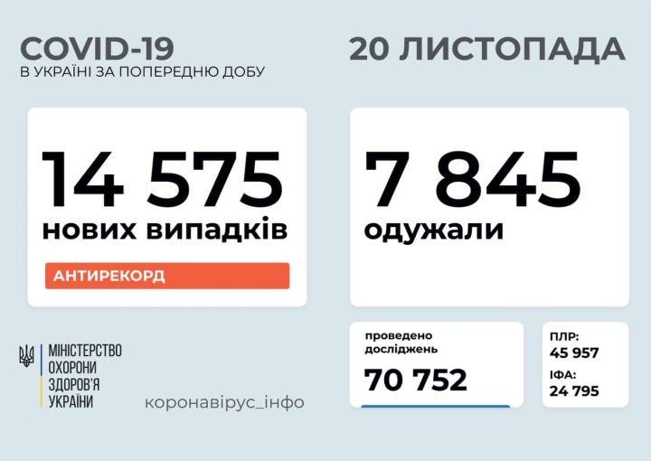 14 575 нових випадків коронавірусної хвороби COVID-19 зафіксовано в Україні станом на 20 листопада 2020 року. Зокрема, захворіли 549 дітей та 613 медпрацівників.
