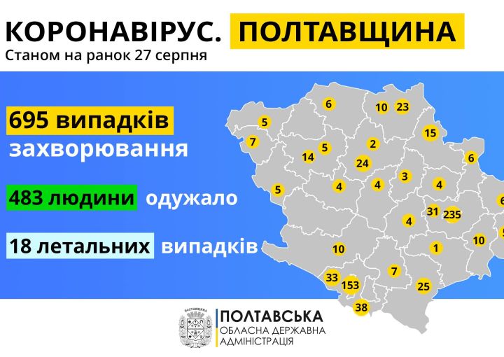 Загалом від початку карантину в області діагностували 695 випадків захворювання на COVID-19. Всього зареєстровано 18 випадків смерті, нових за добу – 1 (Чутівський район). Одужали 483 жителі регіону. Продовжують лікування 194 людини. Географія поширення інфекції: