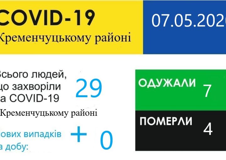За даними Кременчуцького МВПЛД ДУ «Полтавський ОЛЦ МОЗ України» станом на вечір 07 травня 2020 року в Кременчуцькому районі 29 лабораторно підтверджених випадків COVID-19, з них 4 летальних. Нових випадків за добу – 0, одужали - 7. Контактних осіб – 195.